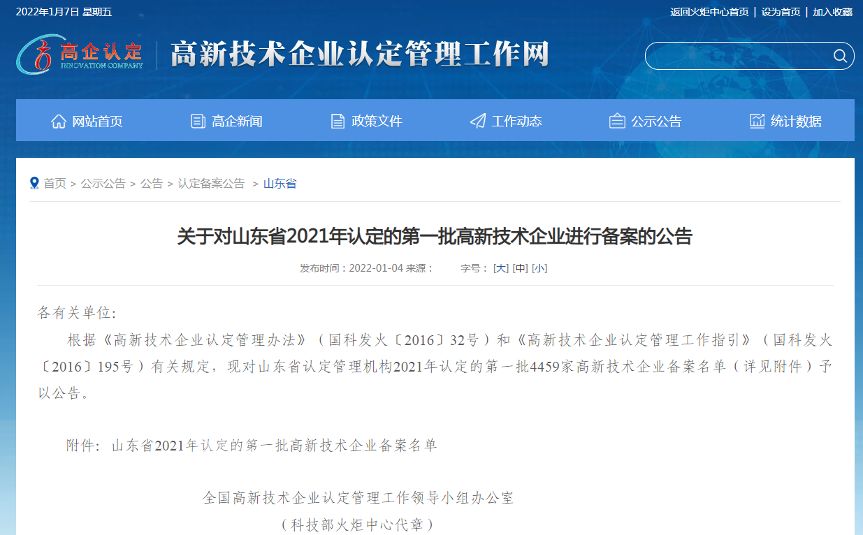 2022年1月4日,全国高新技术企业认定管理工作领导小组办公室发布《关于对山东省2021年认定的第一批高新技术企业进行备案的公告》。据公告显示,山东奥翔电力工程设计咨询有限公司被列入《山东省2021年认定的第一批高新技术企业备案名单》。