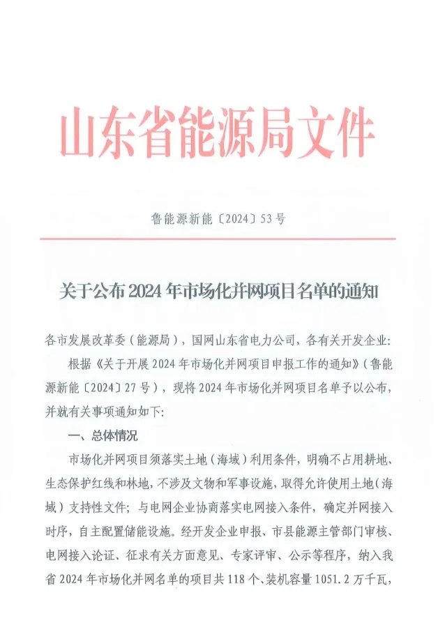 能源资讯丨光伏项目10.46GW!山东2024年市场化并网项目名单公布(附完整名单)