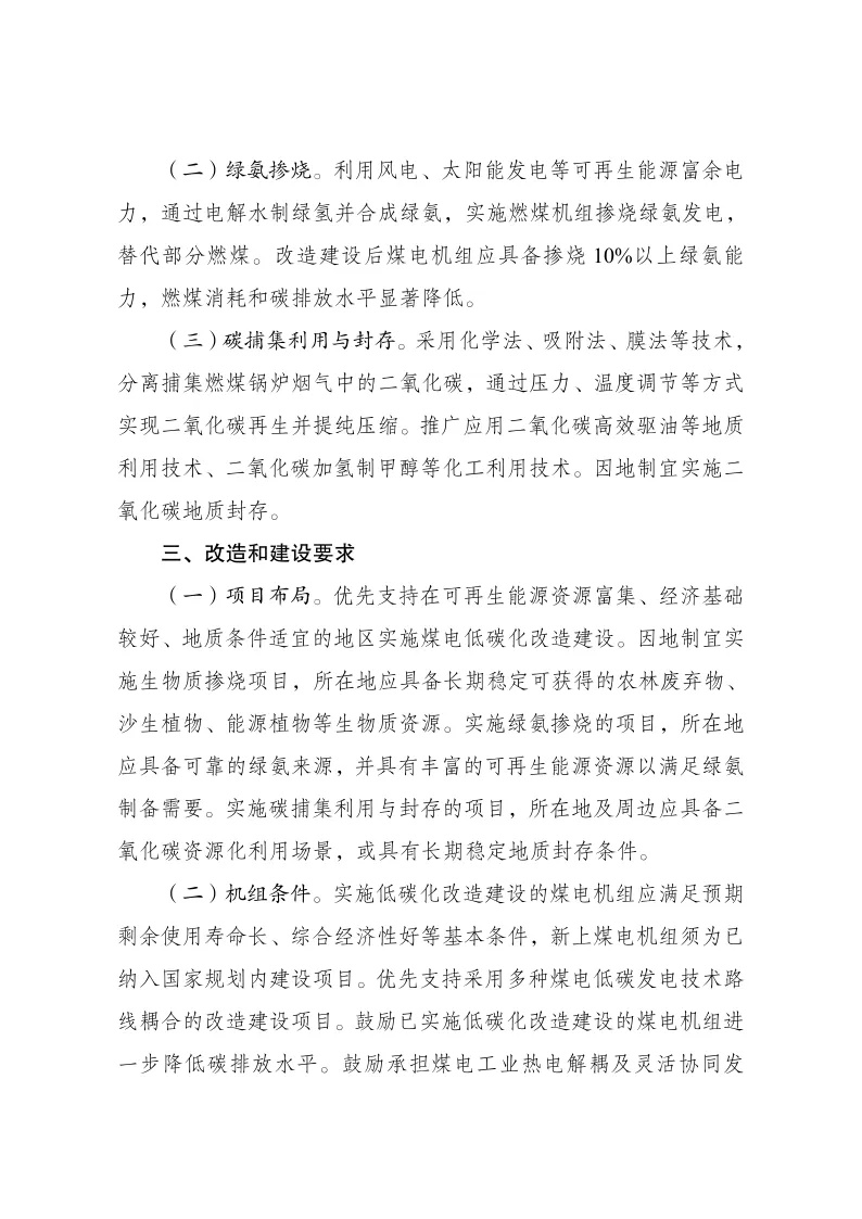 (二)机组条件。鼓励承担煤电工业热电解耦及灵活协同发电、煤电安全高效深度调峰等技术攻关任务的机组实施低碳化改造。鼓励煤炭与煤电联营、煤电与可再生能源联营“两个联营”和沙漠、戈壁、荒漠地区大型风电光伏基地配套煤电项目率先实施绿氨掺烧示范。煤电低碳化改造建设项目应严格执行环境管理制度,确保各类污染物达标排放。绿氨掺烧项目氨存储设施原则上应建于煤电机组厂区外,项目实施单位应进一步明确并严格执行具体管理要求。